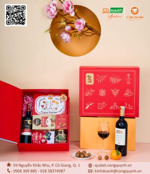 Hộp quà tết 2024 Xuân Phát Tài chi nhìn qua chúng đã thấy được sự sang trọng của set quà với bánh nhập khẩu từ Ý, Vang từ Chile, Kẹo socola từ Thái và chè ô long cao cấp.